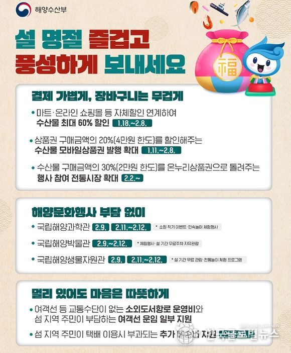 · 상품권 구매금액의 20%(4만 원 한도)를 할인해 주는 수산물 모바일상품권 발행 확대 (1.11.~2.8.)