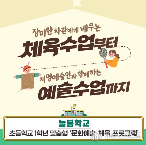 (한국글로벌뉴스 - 박경희 기자) 문화체육관광부는 ‘2024년 늘봄학교 추진방안’에 따라 오는 1학기부터 초등학교 1학년에게 맞춤형 문화예술·체육 프로그램을 제공합니다.