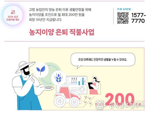 (한국글로벌뉴스 - 박경희 기자) 고령 농업인의 영농 은퇴 이후 생활안정을 위해 농지이양을 조건으로 월 최대 200만 원을 최장 10년간 지급합니다.
