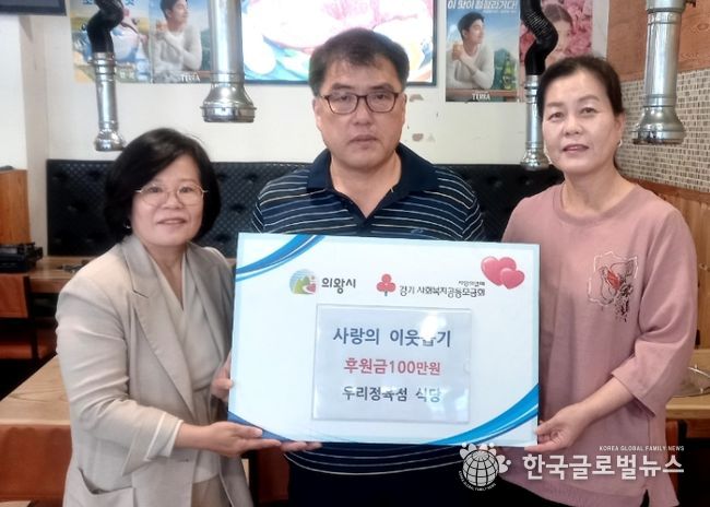 (한국글로벌뉴스 - 박소연 기자) 의왕시 내손1동에 위치한 ‘우리정육점식당(대표 최희주)’은 지난 24일 어려운 취약계층 이웃을 위해 써달라며 1004나눔 성금 100만 원을 내손1동 주민센터에 기탁했다.