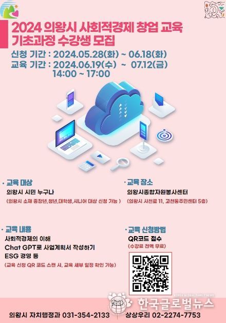 (한국글로벌뉴스 - 박소연 기자) 의왕시는‘2024년 의왕시 사회적경제 창업교육’기초과정 수강생을 모집한다고 밝혔다.