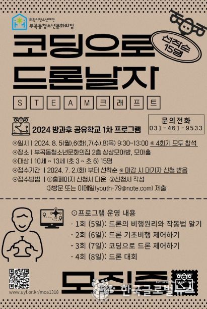 (한국글로벌뉴스 - 박소연 기자) 의왕시청소년재단 부곡동청소년문화의집에서 2024 방과후 공유학교 STEAM크래프트 1차프로그램 ‘코딩으로 드론날자’참가자를 모집한다.