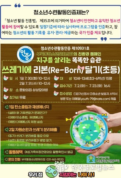 (한국글로벌뉴스 - 박소연 기자) 부곡동청소년문화의집에서는 청소년수련활동인증 제10931호‘쓰레기에 리본(re-born) 달기(초등)’ 참가자를 모집한다.