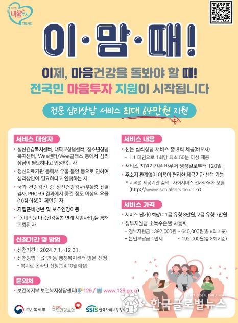 대상자는 오는 7월 1일부터 구비서류를 갖춰 주민등록상 거주지 행정복지센터에 방문하면 신청할 수 있다. 선정된 바우처 서비스 대상자에게는 120일 동안 총 8회의 대면 심리상담이 가능한 바우처가 제공된다.