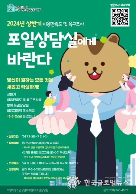 (한국글로벌뉴스 - 박소연 기자) 의왕시청소년상담복지센터 포일상담실은 청소년 및 부모 등 이용자를 대상으로 ‘2024년 상반기 이용만족도 및 욕구조사’를 운영한다.