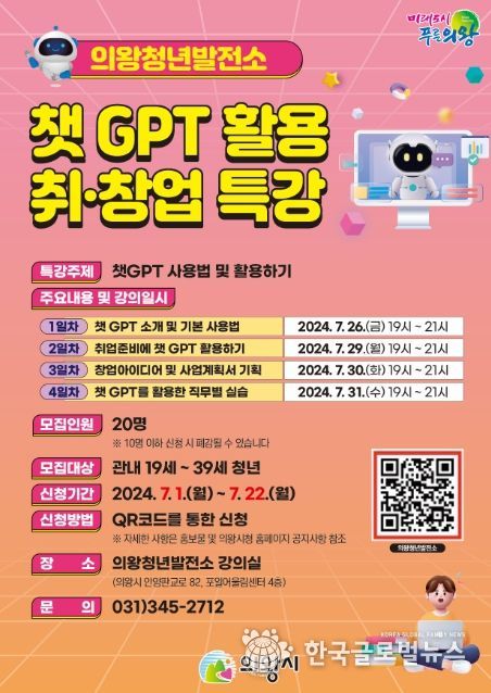 (한국글로벌뉴스 - 박소연 기자) 의왕시가 인공지능 기술을 기반으로 취·창업자의 경쟁력을 강화하기 위해 7월 26일부터 4일 과정으로 ‘챗GPT 활용 취·창업 특강’을 운영한다.
