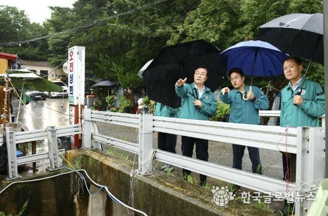 (한국글로벌뉴스 - 박소연 기자) 김성제 의왕시장이 18일 호우 피해 예방을 위해 학의천, 오전천, 왕곡천 등 하천과 급경사지, 저수지 등 풍수해 취약지를 점검하고, 지속적인 예찰과 선제적인 조치로 인명피해가 발생하지 않도록 최선을 다할 것을 지시했다.