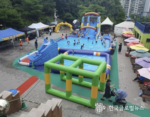 물놀이장에는 아동들이 안전하게 뛰어놀 수 있는 에어바운스형 슬라이드와 풀장을 초등학생용과 영유아용으로 구분해 운영한다. 또 함께 온 가족들의 휴식과 편의를 위해 간이카페와 그늘쉼터, 파라솔 등 부대시설도 구비했다.