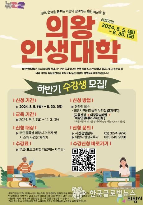 (한국글로벌뉴스 - 박소연 기자) 의왕시가 시민의 평생학습 기회 확대와 삶의 질 향상을 위해 금융기관, 카페, 대학교, 종교시설, 공동주택 등 다양한 시설에서 개설하는 ‘의왕인생대학’ 하반기 강좌 수강생을 8월 30일까지 모집한다.