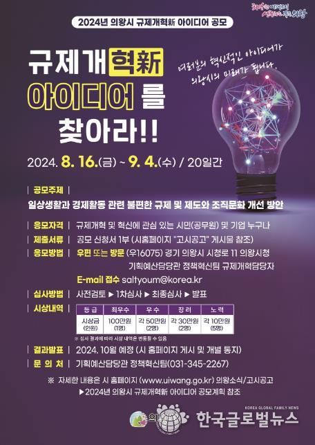 (한국글로벌뉴스 - 박소연 기자) 의왕시는 불합리한 규제를 발굴하고 혁신적인 조직문화를 개선하기 위해 ‘2024년 의왕시 규제개혁新 아이디어 공모’를 추진한다고 밝혔다.