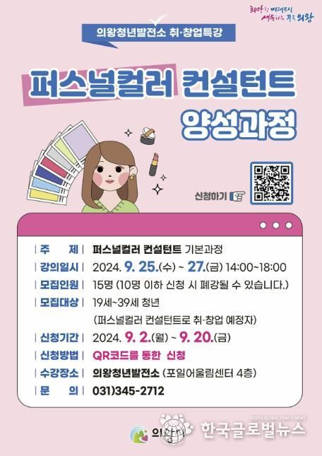 (한국글로벌뉴스 - 박소연 기자) 의왕시는 청년들의 취·창업 기회를 다양화하기 위해 ‘퍼스널컬러 컨설턴트 양성과정’을 개설하고 9월 2일부터 20일까지 교육생을 모집한다고 밝혔다.