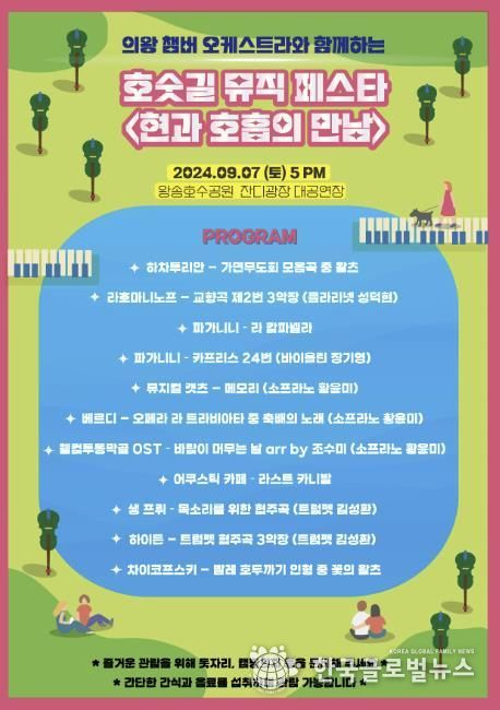 (한국글로벌뉴스 - 박소연 기자) 의왕 챔버 오케스트라는 9월 7일 오후 5시 의왕 왕송호수공원 잔디광장에서 클래식 연주회 ‘호숫길 뮤직 페스타 2 – 현과 호흡의 만남’을 개최한다고 밝혔다.