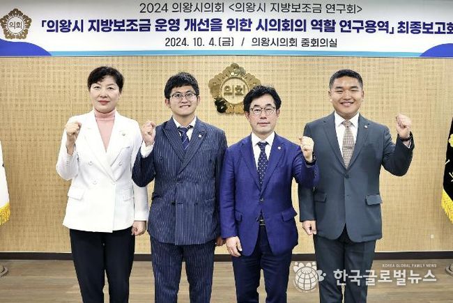 (한국글로벌뉴스 - 박소연 기자) 의왕시의회 의원연구단체 ‘의왕시 지방보조금 연구회’는 4일 시의회 중회의실에서 '의왕시 지방보조금 운영 개선을 위한 시의회의 역할'연구용역 최종보고회를 개최했다.
