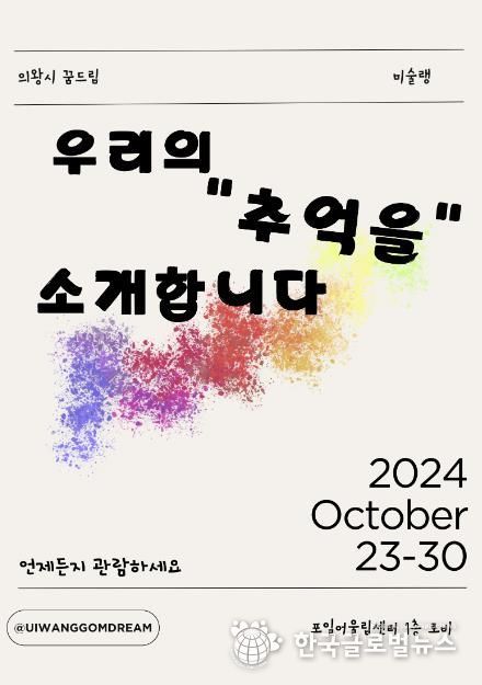 (한국글로벌뉴스 - 박소연 기자) 의왕시청소년재단 산하 의왕시학교밖청소년지원센터에서 활동하고 있는 미술 동아리 ‘미술랭’은 오는 23일부터 30일까지 포일어울림센터 1층에서 미술 작품 전시를 개최한다.