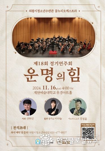 (한국글로벌뉴스 - 박소연 기자) 의왕시청소년재단 산하 의왕시청소년수련관은 오는 11월 16일 오후 4시 계원예술대학교 우경아트홀에서 꿈누리오케스트라의 제18회 정기연주회 ‘운명의 힘’을 개최한다고 밝혔다.