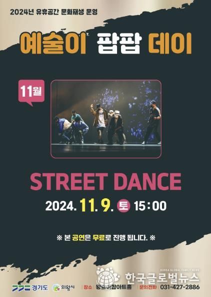 (한국글로벌뉴스 - 박소연 기자) 의왕시가 오는 9일 토요일 오후 3시 왕림이팝아트홀에서 애니메이션 크루의 ‘스트릿 댄스’ 공연을 선보인다.
