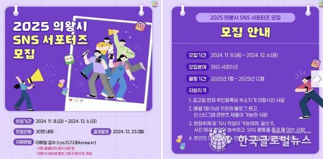 (한국글로벌뉴스 - 박소연 기자) 의왕시는 시민들에게 시정 소식과 다양한 정보를 생생하게 전달할 ‘2025년 의왕시 SNS 서포터즈’를 12월 6일까지 모집한다고 밝혔다.