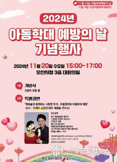(한국글로벌뉴스 - 박소연 기자) 오산시는 아동학대 예방의 날(11월 19일) 및 아동학대예방주간(기념일부터 1주일간)을 맞이해 ‘아동학대 예방의 날 기념행사’및 ‘온오프라인 캠페인’을 진행한다.
