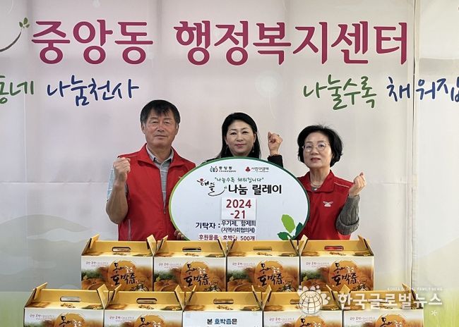 (한국글로벌뉴스 - 박소연 기자) 오산시 중앙동은 지난 12일 중앙동 지역사회보장협의체 우기제 위원장, 함제희 위원이 관내 저소득 취약계층을 위해 호박즙 500개를 기탁했다고 전했다.