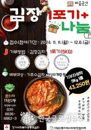 (한국글로벌뉴스 - 박소연 기자) 오산시 대원2동 지역사회보장협의체는 '2024년 김장 1포기+ 나눔행사'를 이달 11일부터 다음달 6일까지 4주간 진행한다.
