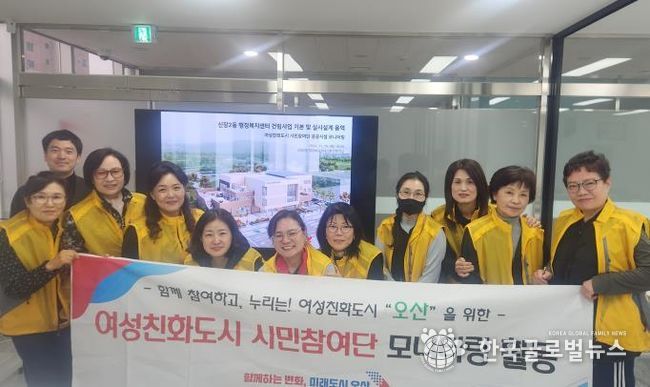 (한국글로벌뉴스 - 박소연 기자) 오산시는 지난 14일 시민이 편안하고 여성이 안전한 공공시설 건립 지원을 위한 '여성친화도시 조성 시민참여단' 모니터링 활동을 신장2동 행정복지센터에서 실시했다.