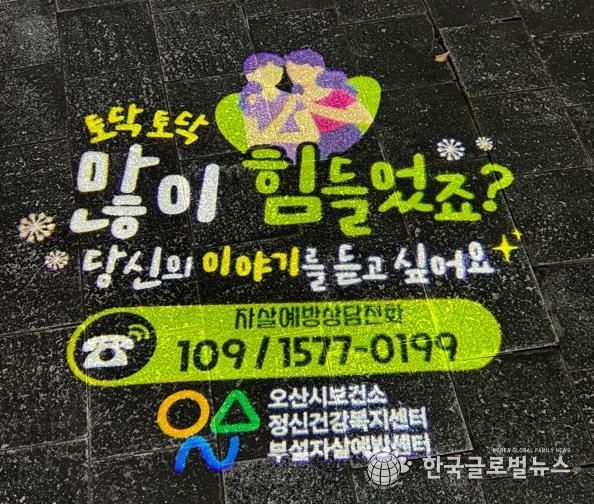 (한국글로벌뉴스 - 박소연 기자) 오산시정신건강복지센터 부설 자살예방센터는 자살예방인식개선과 생명존중문화 확산을 위해 오산시 관내 아파트에 생명사랑 로고젝터를 설치했다.