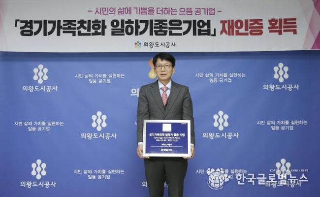 (한국글로벌뉴스 - 박소연 기자) 의왕도시공사는 지난 20일 경기도로부터 ‘경기가족친화 일하기 좋은기업’ 재인증을 받았다고 밝혔다.