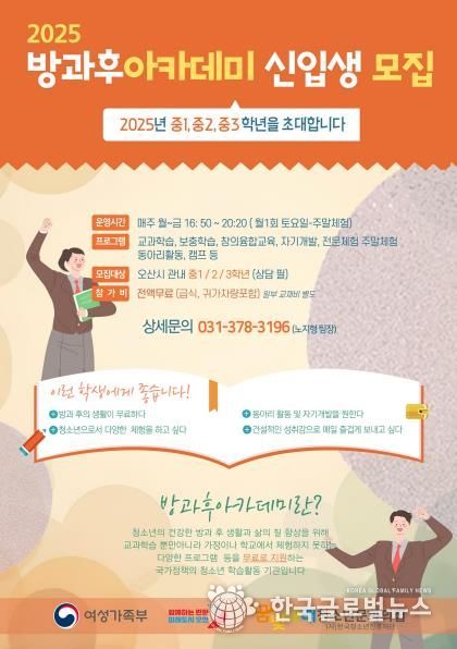 (한국글로벌뉴스 - 박소연 기자) 오산시 꿈빛나래청소년문화의집은 올 연말까지 2025년 ‘청소년방과후아카데미’ 신입생을 모집한다. 모집 대상은 방과 후 돌봄이 필요한 오산시 관내 중학교 1~3학년(2025년 기준) 청소년이다.