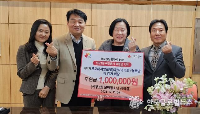 (한국글로벌뉴스 - 박소연 기자) 오산시 신장1동은 세교데시앙포레 아파트 경로당 이경자 회장이 이달 11일 관내 우수 청소년들의 장학금으로 100만원을 기탁했다고 밝혔다.