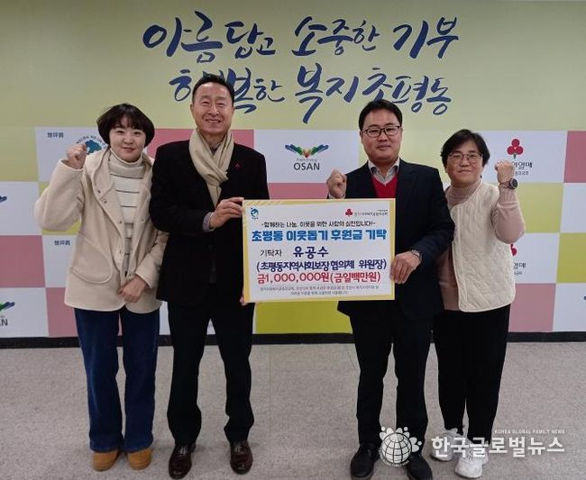 (한국글로벌뉴스 - 박소연 기자) 오산시 초평동은 지난 11일 초평동지역사회보장협의체 위원장으로 활동 중인 유공수 송탄중앙병원장례식장 대표가 초평동 내 복지 사각지대에 놓인 어려운 이웃을 돕기 위해 100만 원의 성금을 기탁했다고 밝혔다.