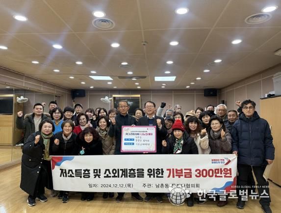 (한국글로벌뉴스 - 박소연 기자) 오산시 남촌동은 지난 12일 연말을 맞아 남촌동 통장단협의회에서 지역 내 저소득층과 취약계층을 위해 기부금 300만 원을 기탁했다고 밝혔다.