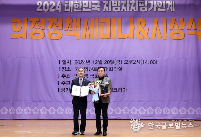 (한국글로벌뉴스 - 박소연 기자) 오산시의회 이상복의장은 지난 20일 국회 의원회관 대회의실에서 여의도정책연구원이 주관한 2024년 대한민국 지방자치 평가연계 의정대상을 수상했다.