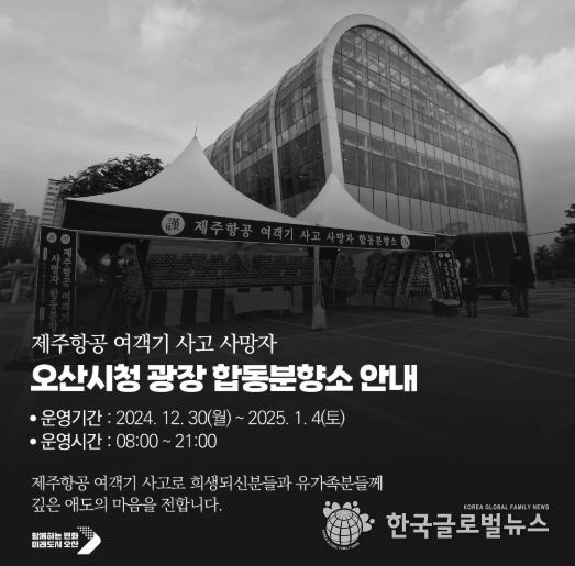 (한국글로벌뉴스 - 박소연 기자) 오산시는 이번 제주항공 여객기 추락사고로 희생된 시민을 추모하고 유가족과의 슬픔을 기리기 위해 연말연시에 계획된 모든 주요 행사를 전면 취소했다.
