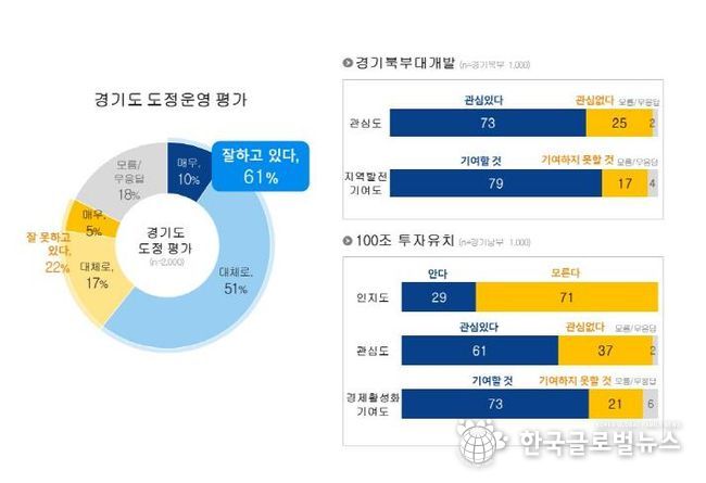 (한국글로벌뉴스 - 박소연 기자) 경기도민 10명 중 6명이 도정 운영을 긍정적으로 평가한 것으로 나타났다.