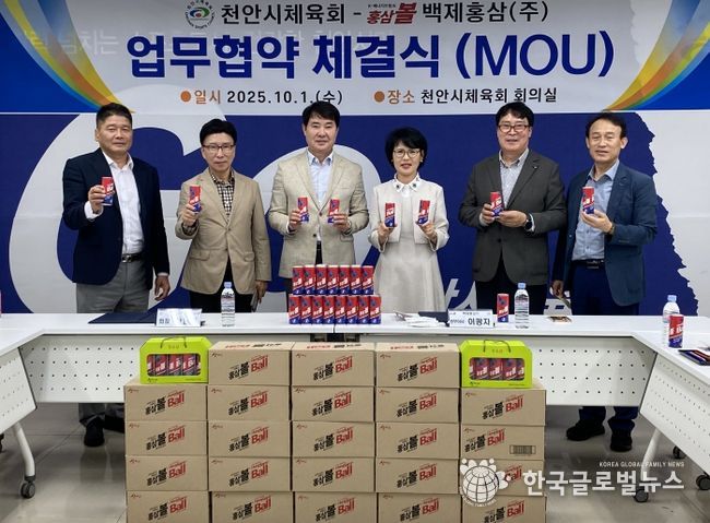 (한국글로벌뉴스 - 박지형 기자) 천안시체육회는 지난 1일 백제홍삼㈜와 체육인 건강증진을 위해 업무협약을 체결했다고 밝혔다.