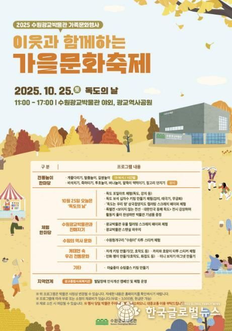 (한국글로벌뉴스 - 박소연 기자) 수원광교박물관은 독도의 날인 10월 25일 오전 11시부터 오후 5시까지 수원광교박물관 야외(광교역사공원)에서 ‘2025 수원광교박물관 가족문화행사–이웃과 함께하는 가을문화축제’를 연다.