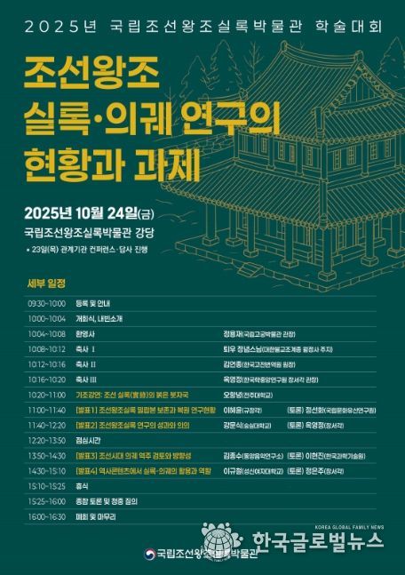 (한국글로벌뉴스 - 박소연 기자) 국가유산청 국립고궁박물관 국립조선왕조실록박물관은 10월 23일부터 24일까지 실록박물관 등 강원도 평창 일원에서 ‘조선왕조실록·의궤 연구의 현황과 과제’를 주제로 학술행사를 개최한다.