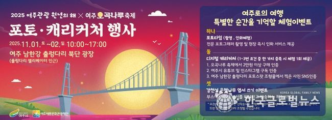 (한국글로벌뉴스 - 김정현 기자) 여주시는 ‘2025 여주 관광 원년의 해’를 기념해 오곡나루 축제가 열리는 기간 중 11월 1일부터 2일까지 양일간, 여주 남한강 출렁다리 북단 광장에서 ‘포토‧캐리커처 행사’를 개최한다.