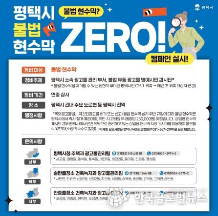 (한국글로벌뉴스 - 박소연 기자) 평택시는 불법 현수막 근절을 위해 ‘불법 현수막 ZERO!’ 캠페인을 전개하고, 강력한 단속 활동에 나선다고 밝혔다.