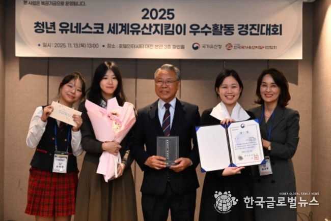 (한국글로벌뉴스 - 박소연 기자) 국가유산청은 (사)한국국가유산지킴이연합회와 11월 13일 오후 1시 대전 호텔인터시티(대전 유성구)에서 '2025 청년 유네스코 세계유산지킴이 우수활동 경진대회'를 개최했다.