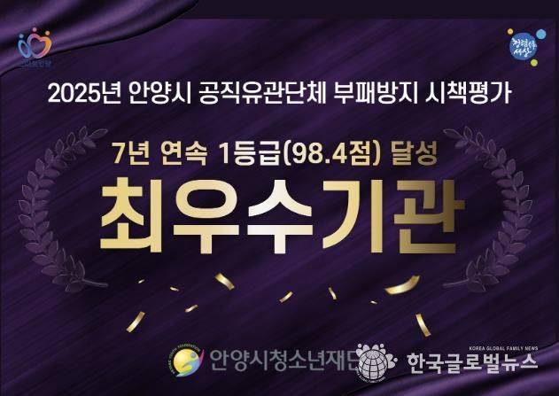 (한국글로벌뉴스 - 박소연 기자) 안양시청소년재단이 2025년 안양시 공직유관단체 부패방지 시책평가에서 7년 연속 최우수기관으로 선정됐다. 재단은 이번 평가에서 총점 98.4점이라는 높은 점수를 획득하며, 안양시 7개 공직유관단체 중 최고 수준의 청렴도와 투명성을 다시 한번 입증했다.