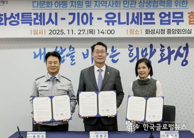 (한국글로벌뉴스 - 박소연 기자) 화성특례시가 27일 시청 중앙회의실에서 유니세프 한국위원회, 기아 주식회사와 ‘다문화아동 지원 및 지역사회 민관 상생 협력을 위한 업무협약’을 체결했다.