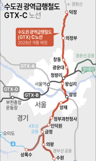 GTX-C는 양주 덕정역에서 출발해 서울 청량리·삼성·양재를 거쳐 수원까지 연결되는 약 86.5 km 노선으로 완공되면 의정부에서 서울 삼성역까지 약 20분 내 이동이 가능하고, 서울 접근성과 수도권 이동 편의성이 크게 개선될 예정이다.