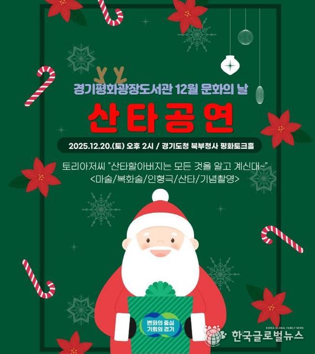 (한국글로벌뉴스 - 박소연 기자) 경기도는 12월 19일과 20일 이틀간 도 북부청사 평화토크홀에서 ‘모두가 함께하는 겨울 감성 공연-함께 읽고, 함께 웃는 하루’를 주제로 경기평화광장도서관 12월 문화의 날 행사를 연다.