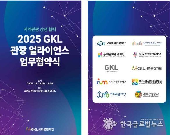 (한국글로벌뉴스 - 김정현 기자) 여주세종문화관광재단은 지난 12월 16일 GKL 사회공헌재단이 주관한 ‘GKL 관광 얼라이언스 업무협약식’에 참석하여, 전국 8개 지역관광 전담기관과 함께 문화·관광 분야 공익사업 협력을 위한 업무협약을 체결했다고 밝혔다.