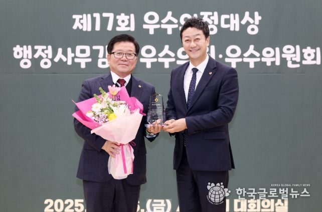 (한국글로벌뉴스 - 박소연 기자) 경기도의회 건설교통위원회 허원 위원장(국민의힘, 이천2)은 26일 경기도의회 대회의실에서 열린 ‘2025년 경기도의회 시상식’에서 대한민국시도의회의장협의회가 수여하는 ‘제17회 우수의정대상’을 수상했다.