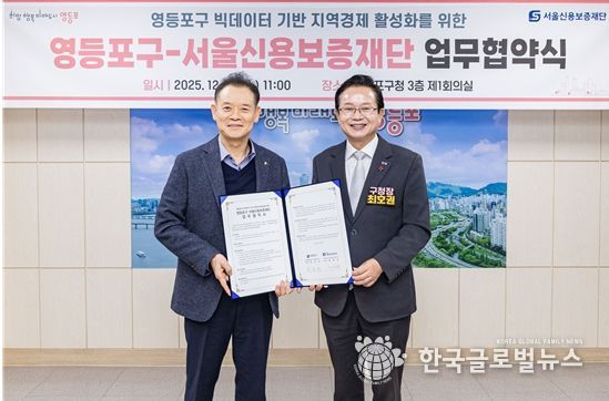 (한국글로벌뉴스 - 박종욱 기자) 서울신용보증재단과 영등포구는 지난 12월 17일 영등포구청에서 ‘지역경제 활성화를 위한 빅데이터 활용’ 업무협약을 체결했다. 영등포구의 정책 기획력과 서울신보의 데이터 역량을 결합해 급변하는 경영환경에 선제적으로 대응하고, 실효성 있는 소상공인 지원책을 마련하겠다는 취지다.
