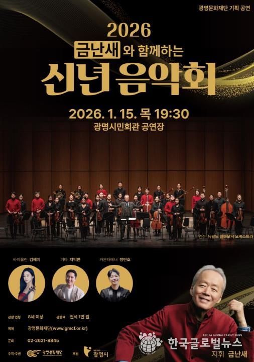 (한국글로벌뉴스 - 박소연 기자) (재)광명문화재단은 2026년 새해를 맞아 지휘자 금난새와 뉴월드 필하모닉 오케스트라가 함께하는 ‘금난새와 함께하는 '신년 음악회'’를 오는 1월 15일 오후 7시 30분, 광명시민회관 공연장에서 개최한다.