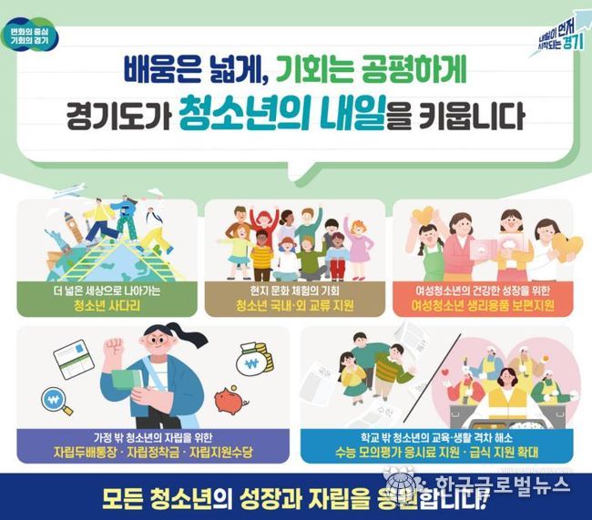 (한국글로벌뉴스 - 박소연 기자) 경기도가 청소년의 건강한 성장과 배움 기회, 생활 안정을 위해 급식, 학습·진로·자립 지원까지 아우르는 다양한 정책을 추진한다.