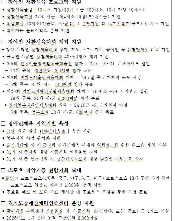 또한 체육 참여 접근성이 상대적으로 낮은 경기북부지역을 위해 제2회 경기북부장애인체육대회 규모를 대폭 확대한다. 운영 종목은 2025년 3종목에서 2026년 5종목으로 늘어나며, 참가 인원도 325명에서 600여 명으로 확대된다.